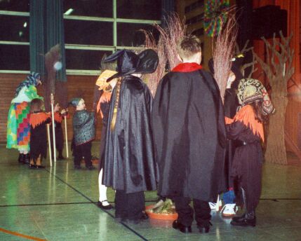 Ein richtiger Vampir übergibt das Weihnachtsgeschenk der Eltern und der Kinder den beiden Gruppenleiterinnen: Ein Gutschein für das Musical “Tanz der Vempire” |